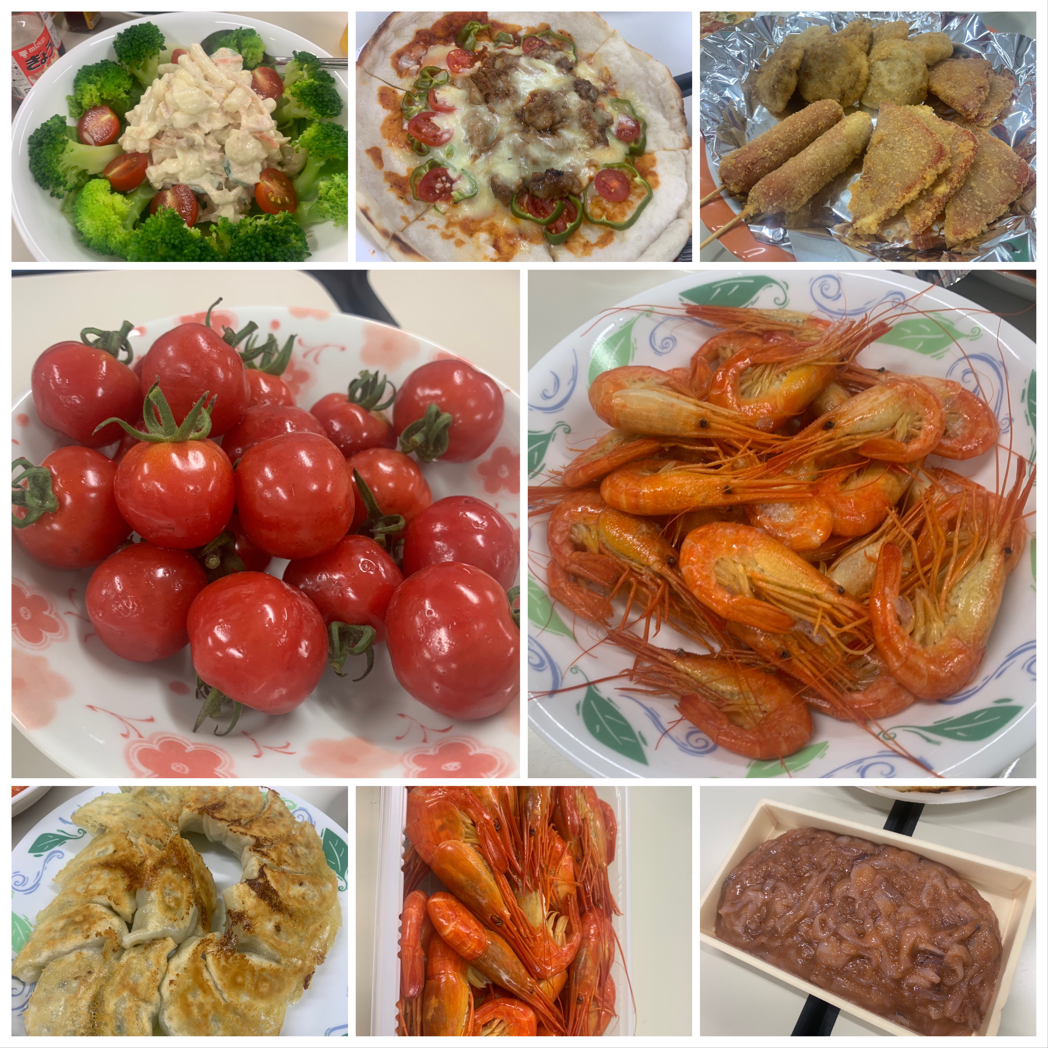 手作りピザ、北海シマ海老、プチプヨトマト、皮付き鮭とば、タラコ入り塩辛、ハムカツ、サラダ、おにぎり!