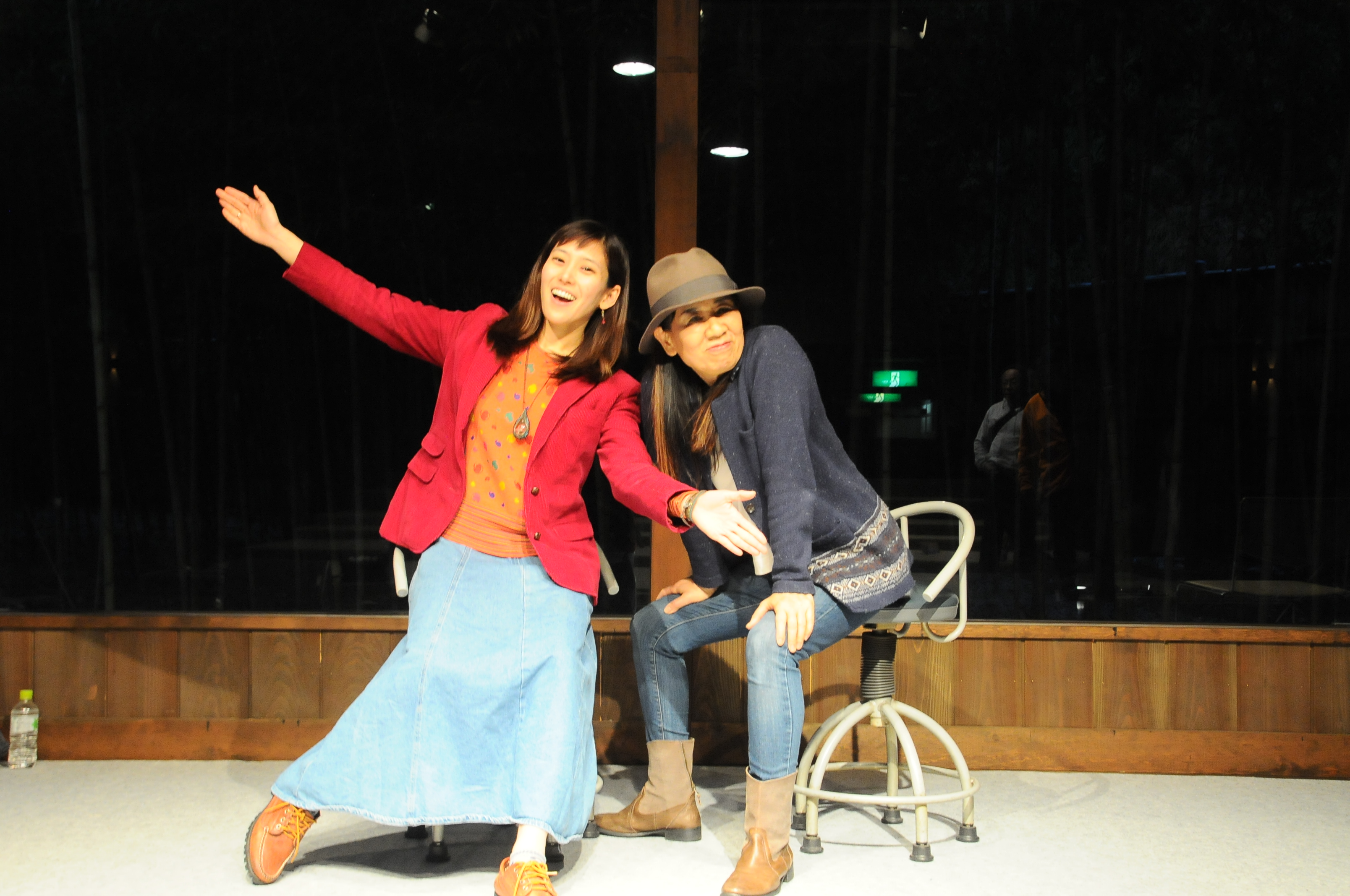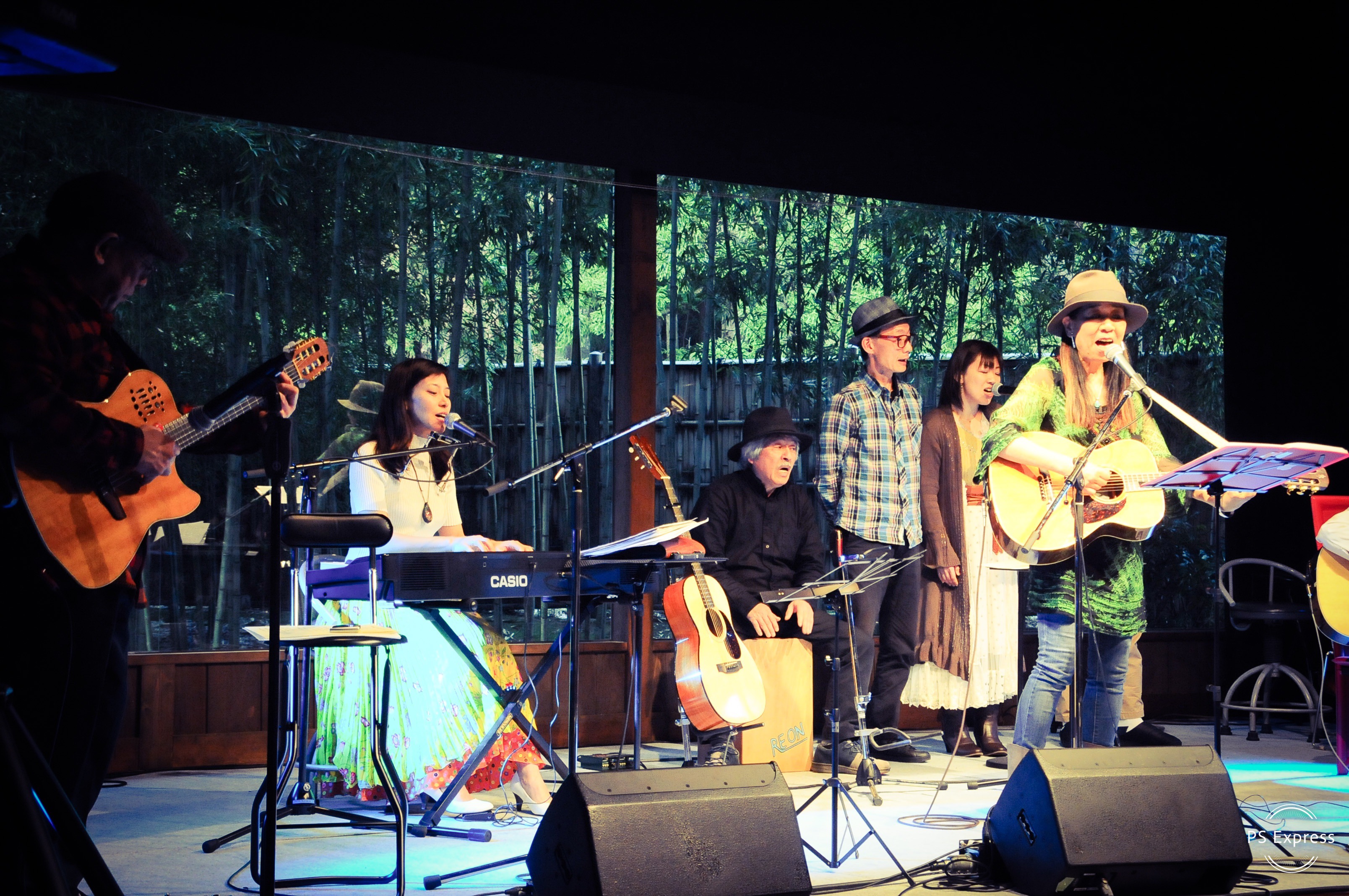 ステージのバックがガラス張りで向こうには竹やぶ。